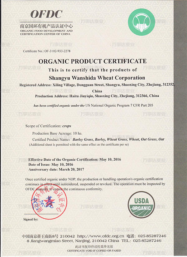 經(jīng)過歷時近兩個月的考察和審核,上虞市萬事達(dá)麥業(yè)有限公司正式獲得NOP美國有機(jī)認(rèn)證的認(rèn)可。