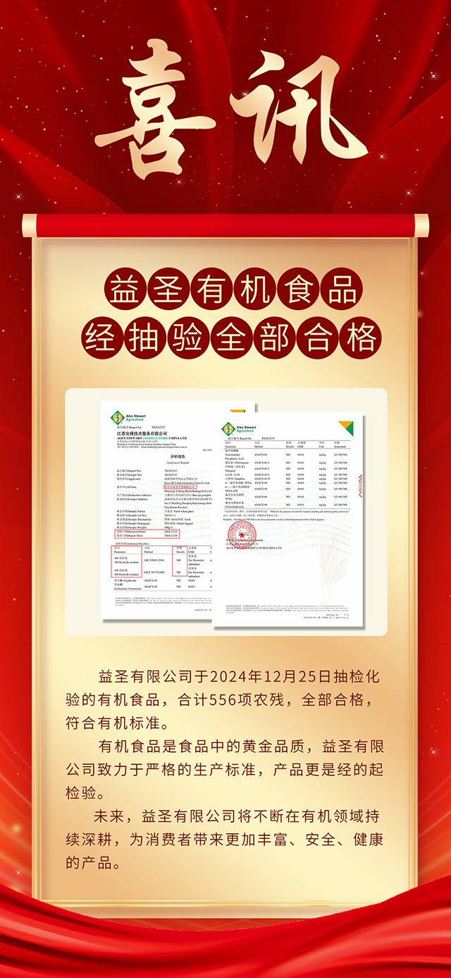 喜訊!益圣有限公司有機(jī)食品經(jīng)抽檢化驗全部合格!
